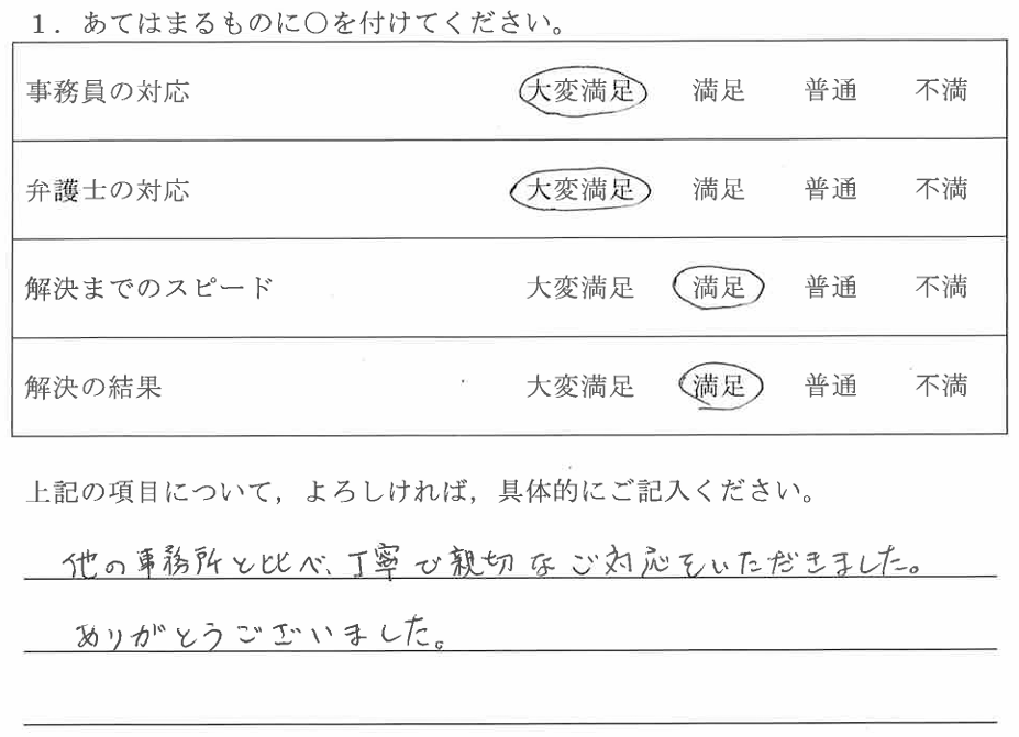 事務員の対応:満足 弁護士の対応:大変満足 解決までのスピード:満足 解決の結果:満足